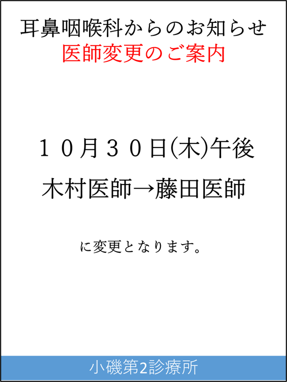 【小磯第2診療所】耳鼻咽喉科 医師変更〔10月30日(木)〕お知らせ