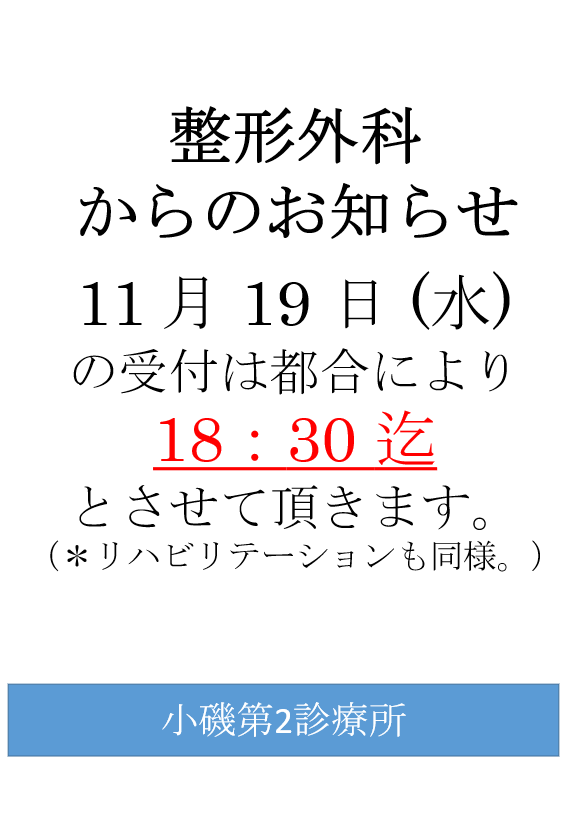 【小磯第2診療所】整形外科 受付時間変更 〔11/19(水) 18:30迄〕