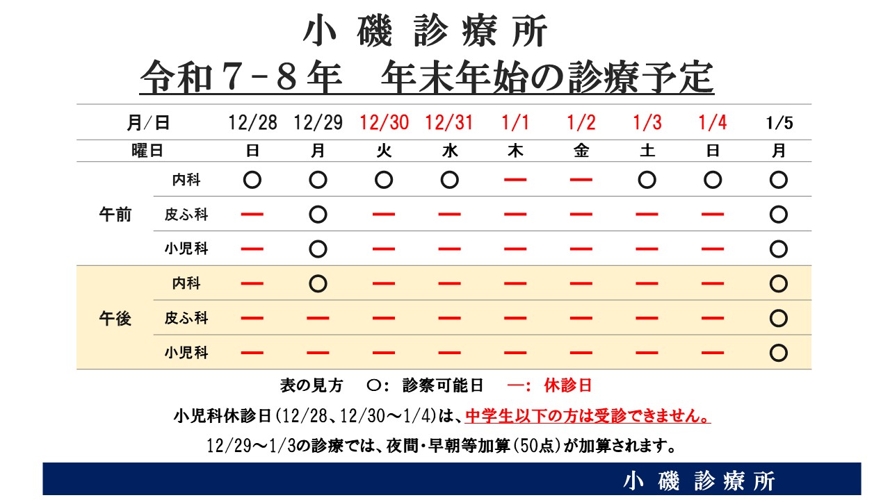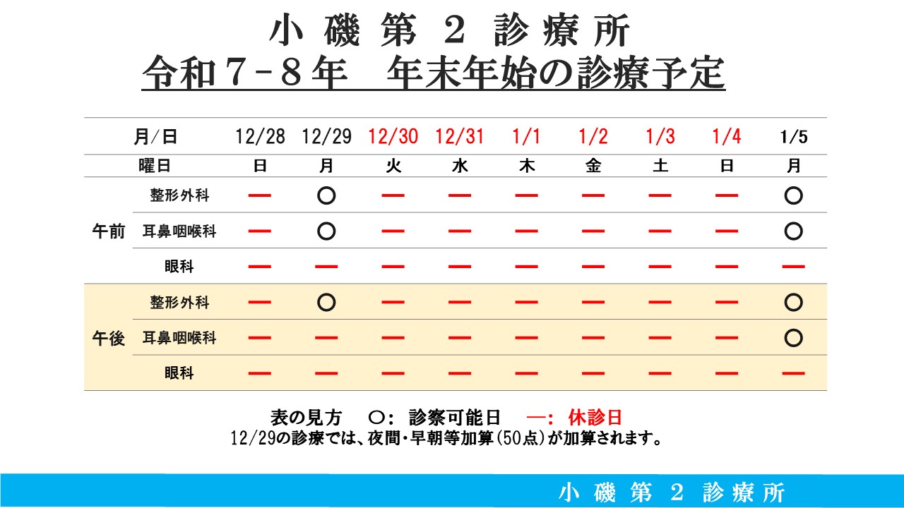 【小磯第2診療所】整形外科 担当医変更〔1/10(土)・1/17(土)〕お知らせ