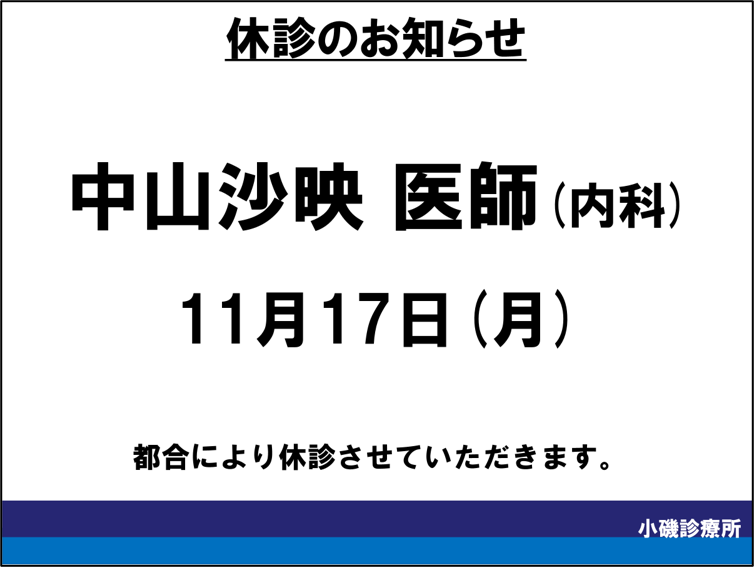 【内科】中山沙映医師休診のお知らせ〔11月17日(月)〕