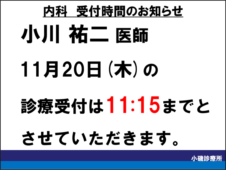 【内科】小川祐二医師 受付時間変更のお知らせ〔11月20日(木)11:15まで〕