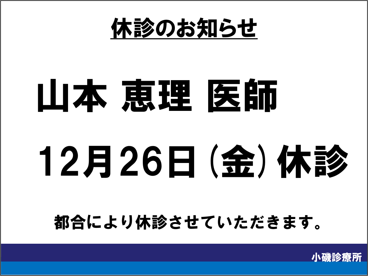 【内科】山本恵理先生 休診のお知らせ〔12月26日(金)〕