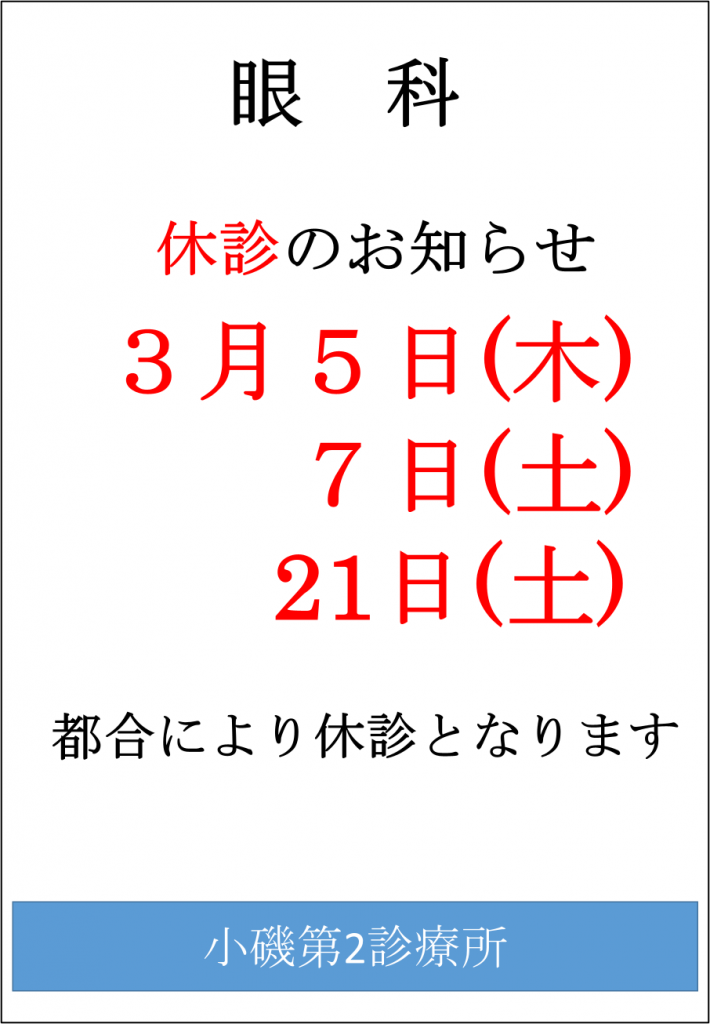 【小磯第2診療所】眼科 休診のお知らせ〔3月5日(木)、7日(土)、21(土)〕