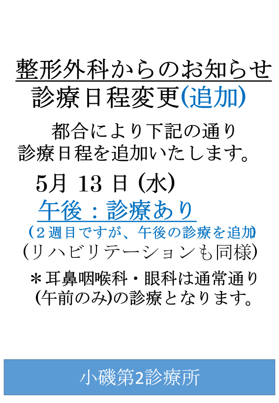 【小磯第2診療所】整形外科 診療日程変更〔5/13(水) 午後 追加〕
