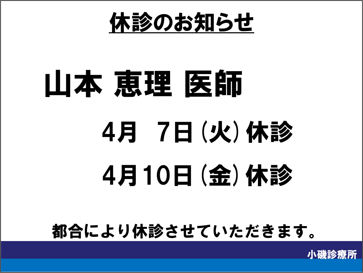 【内科】山本恵理医師 休診のお知らせ〔4月7日(火)、4月10日(金)〕