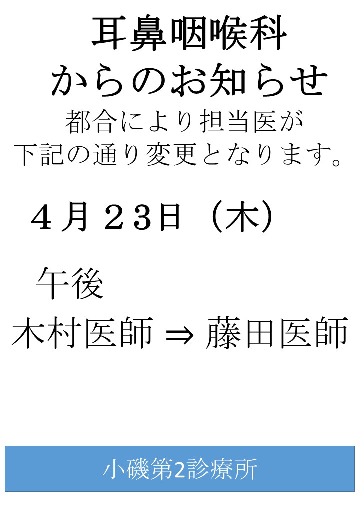 【小磯第2診療所 耳鼻咽喉科】4/23 担当医変更のお知らせ