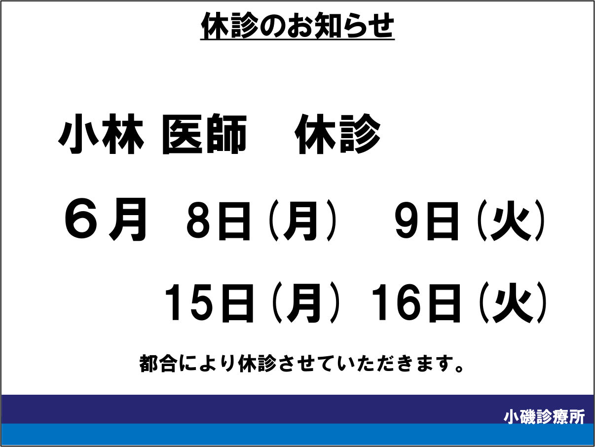 【内科】小林医師 休診のお知らせ〔6月8日(月)、9日(火)、15日(月)、16日(火)〕